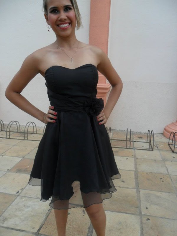 Geisiane com vestido curto, de organça cristal, preta, com detalhe de flor do mesmo tecido de lado.