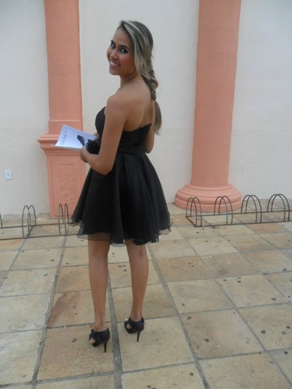 - Geisla (no meio) vestido decote tomara que caia, curto na cor preta, saia tulipa