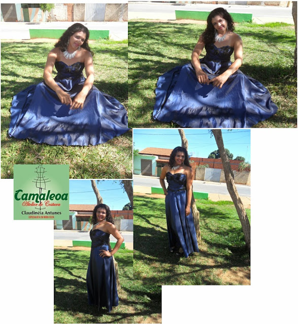 Vestido longo azul Marinho, de tafetá, com corpinho bordado com renda preta e saia gode.